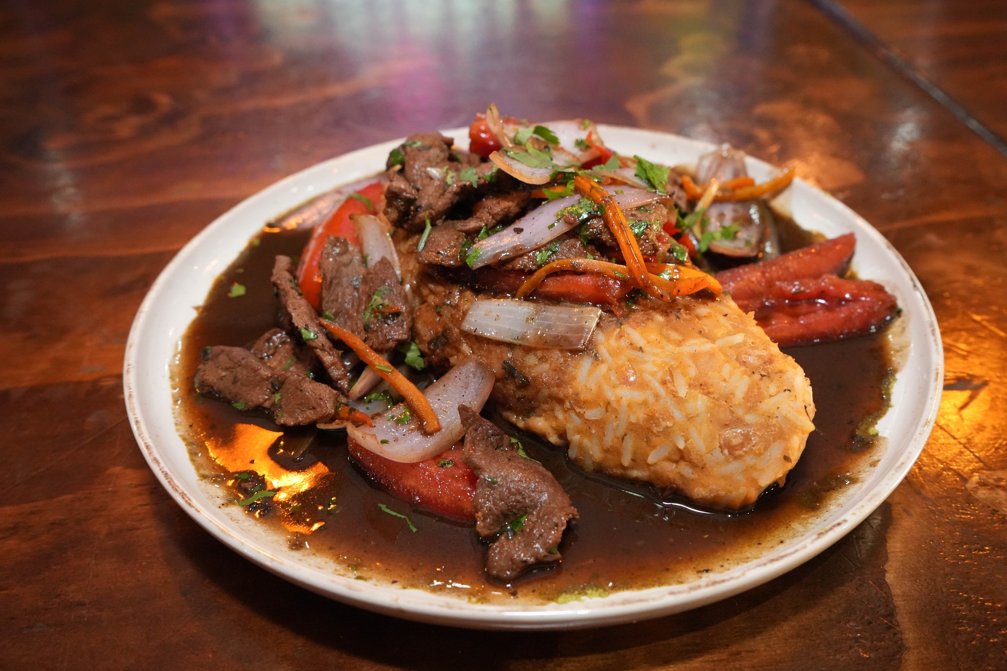 "El corazón de nuestra cocina criolla. Jugosos trozos de lomo fino salteados al wok con cebolla morada, tomates frescos y un toque de cilantro, servido con papas fritas crujientes y arroz con choclo. El sabor ahumado que te hará volver por más."